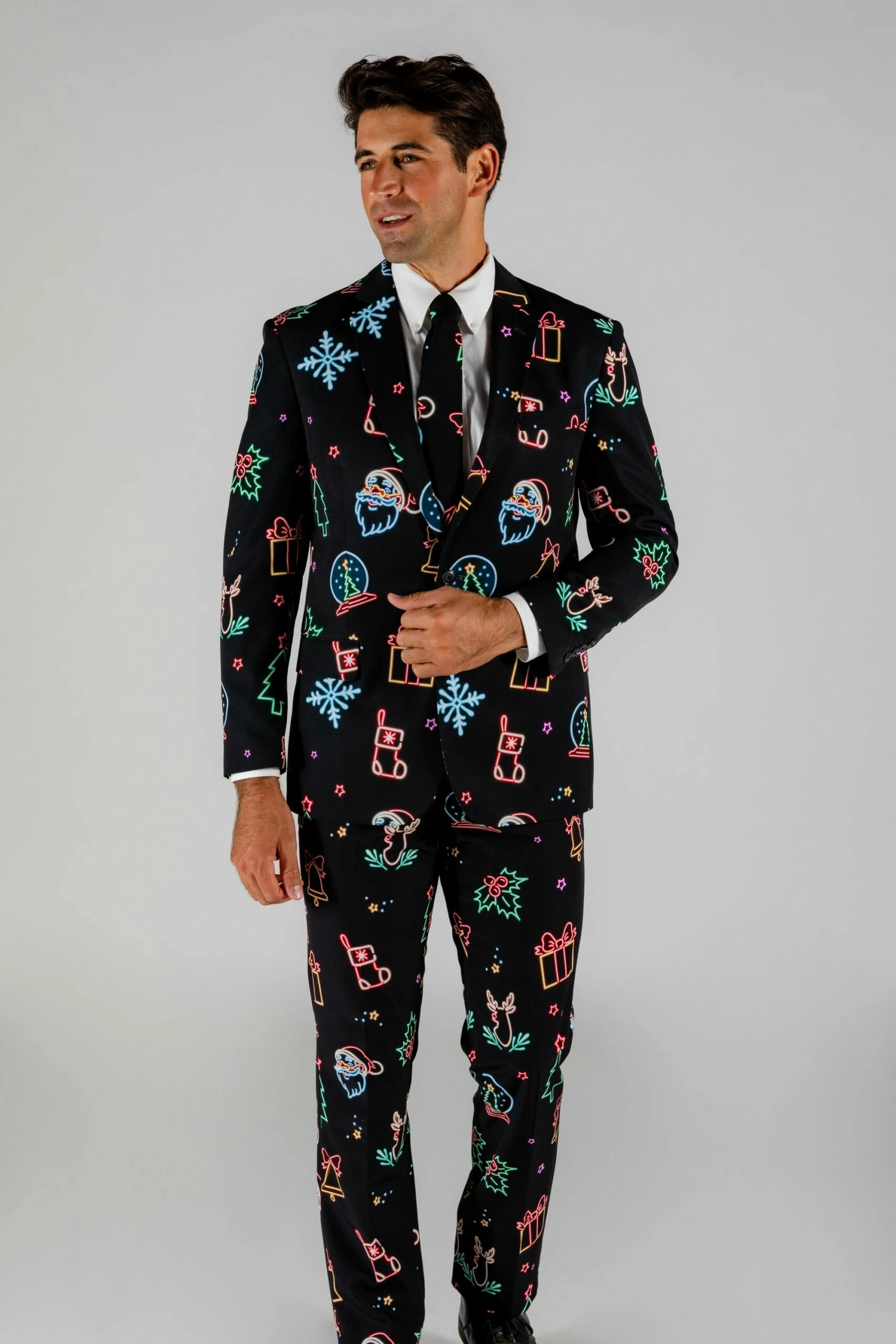 This neon Christmas suit will literally highlight the holidays this year. If the movies “The Nightmare Before Christmas” and “Eyes Wide Shut” had a baby, it would come out wearing this neon lights Christmas blazer. Whether you’re at your hometown dive bar, break dancing at a rave at 3 AM, or just want to impress the in-laws at holiday dinner, this Christmas themed print suit will captivate all eyes.